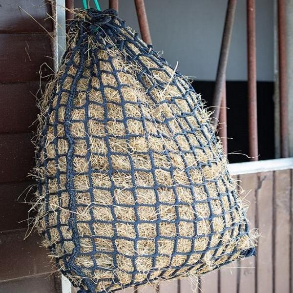 Heavy-Duty Hay net has small meshes (approx. 4.5 x 4.5 cm) and measures 67 x 81 cm. It is made of HTPP material, which makes this net strong and water-repellent. At the top is a loop to pull it together. Because the meshes are small, they can also contain fine hay. This Heavy Duty is also often used as a slow feeder.